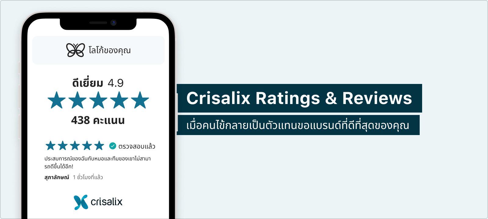 *ตามที่ได้รับข้อมูลจาก Global Newswire, Bright Local, ReviewTrackers และข้อมูล Crisalix ตามลำดับ. **ค่าเฉลี่ยของแพทย์ Crisalix คือ 4.8, สูงกว่า มาตรฐาน 0.5 คะแนน.